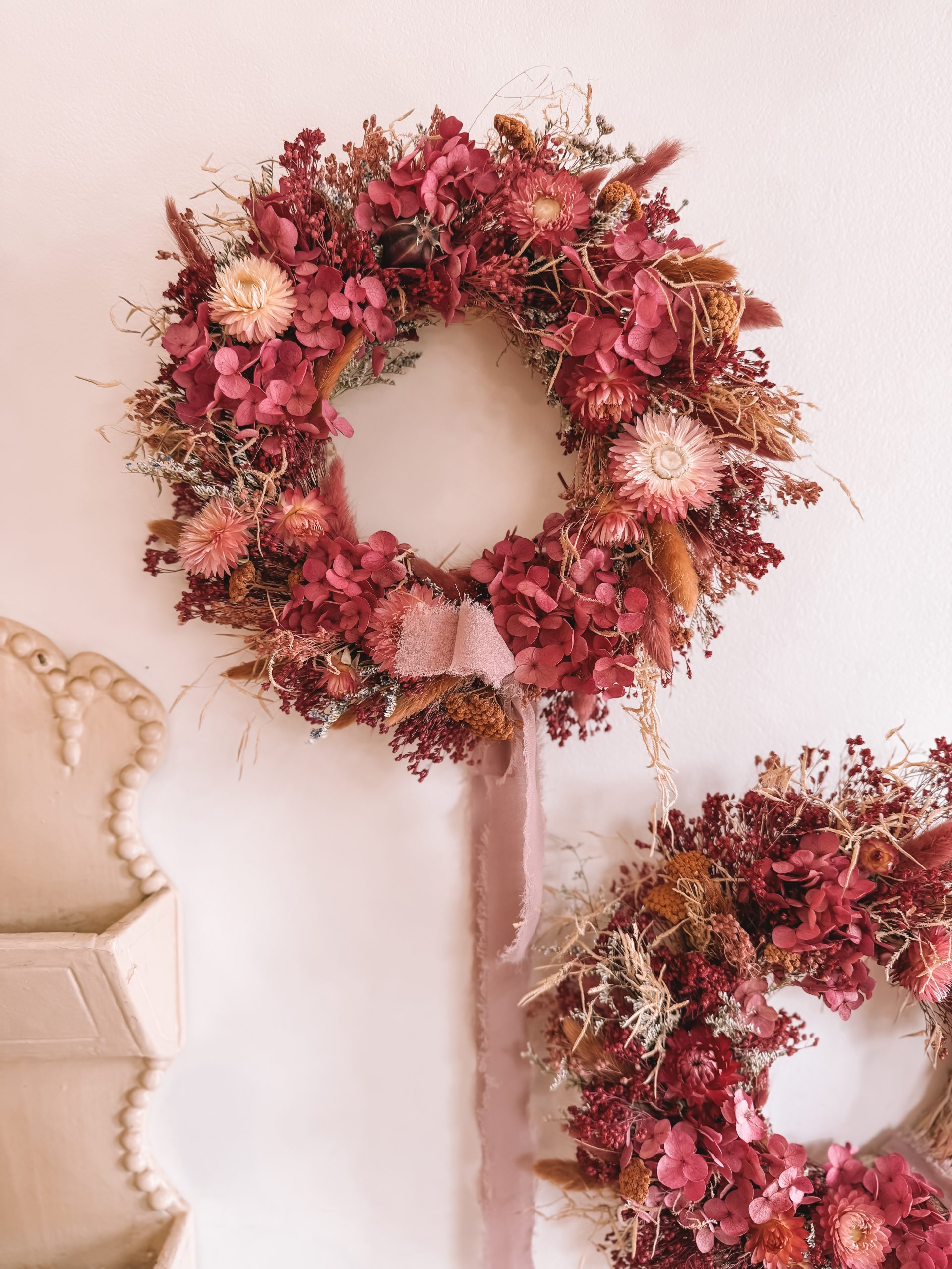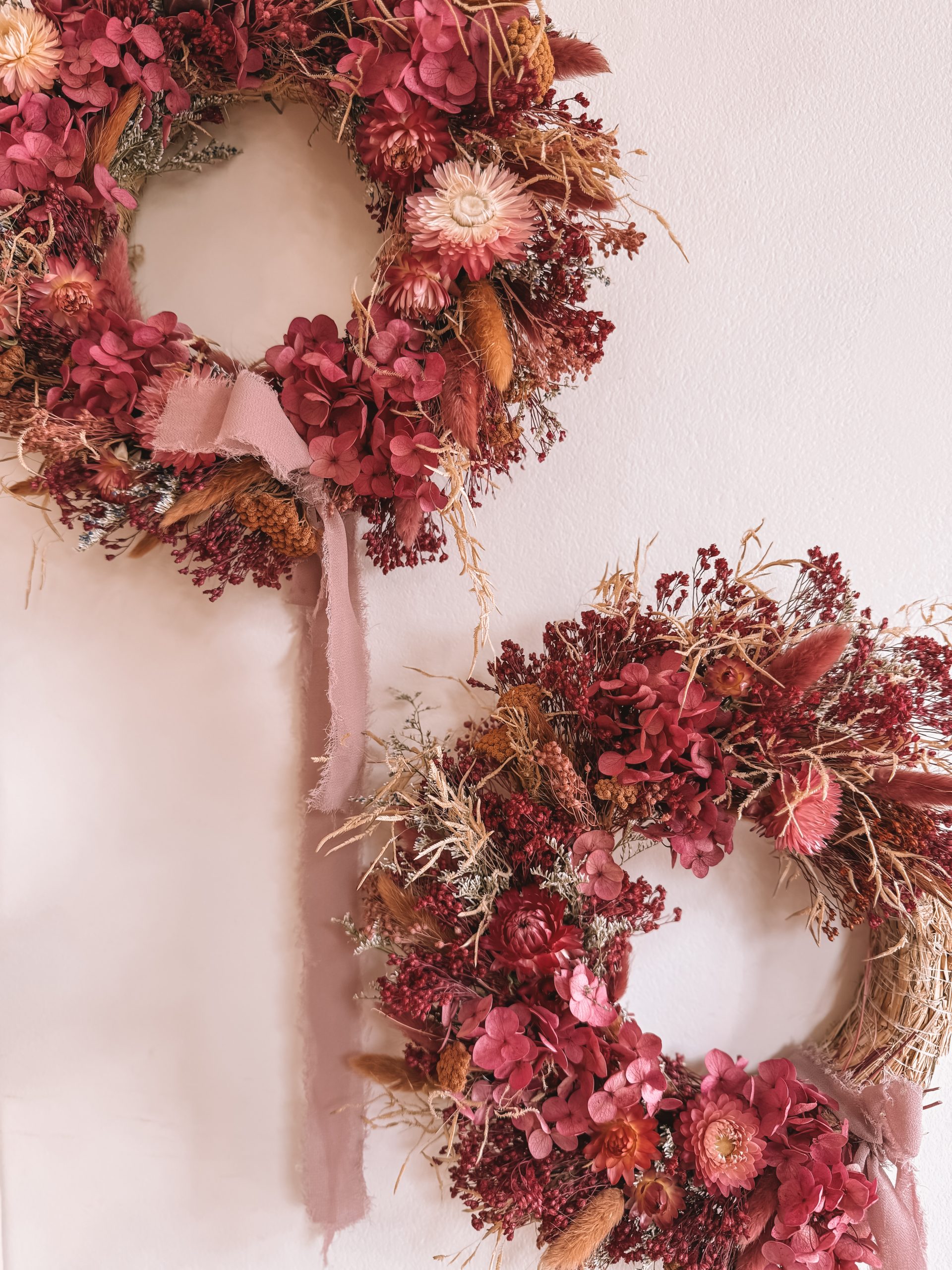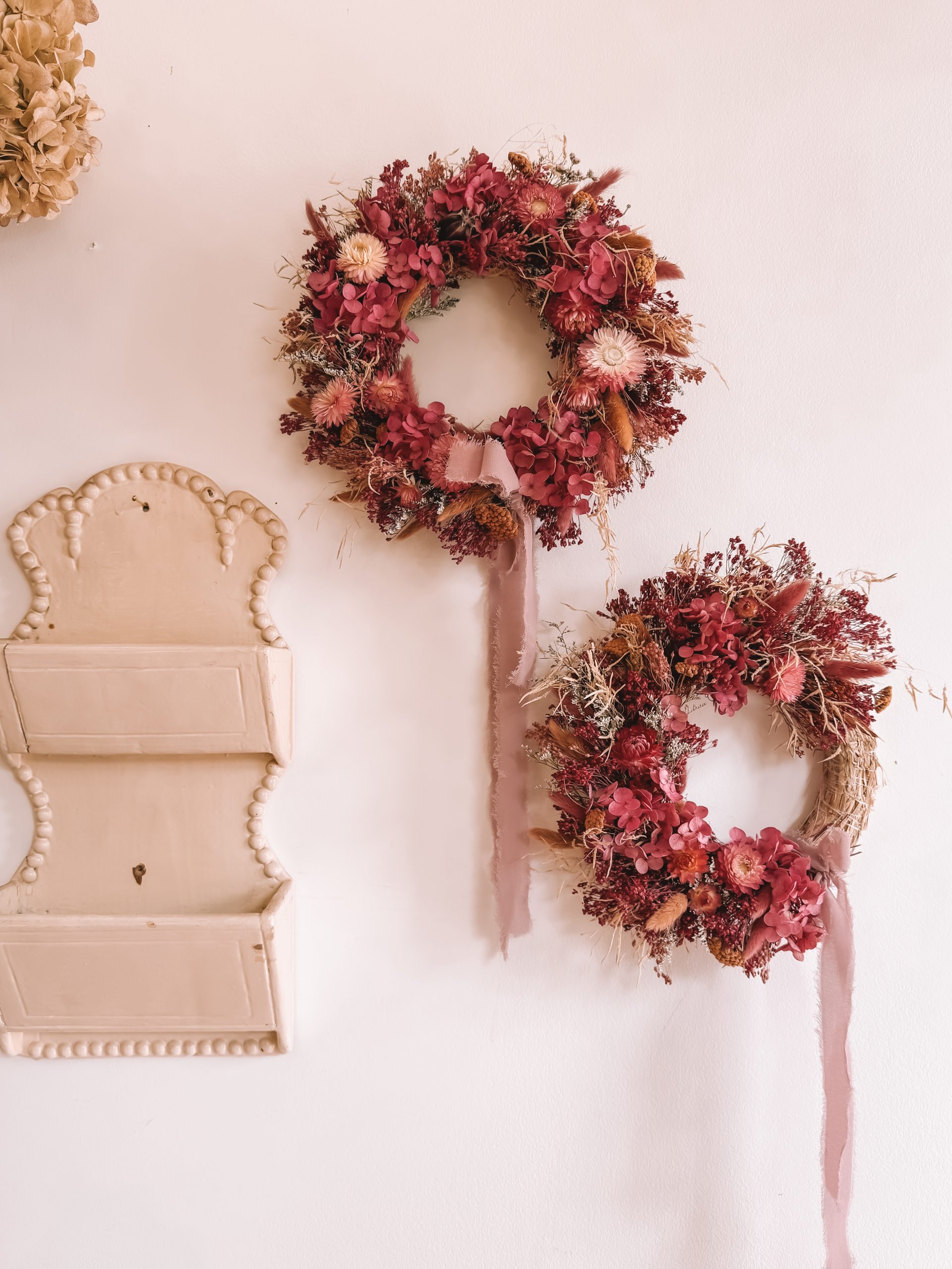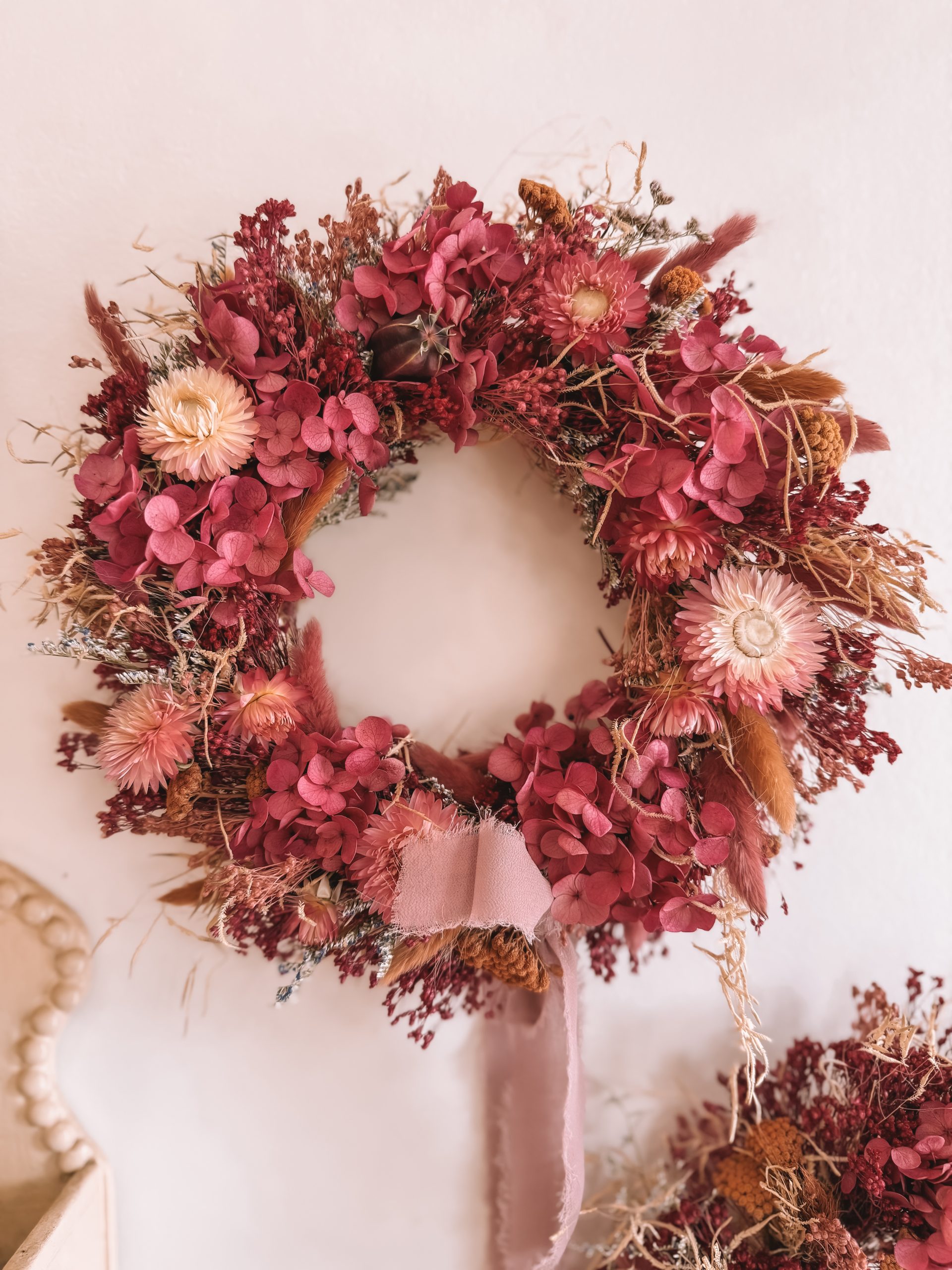 Une création pleine de vitalité et de douceur, composée de fleurs séchées dans des tons framboise, vieux rose et bordeaux. Hortensias, immortelles, glixia, graminées et phalaris s’entrelacent avec délicatesse pour former une composition chaleureuse et joyeuse, rehaussée d’un ruban en tissu frangé assorti.