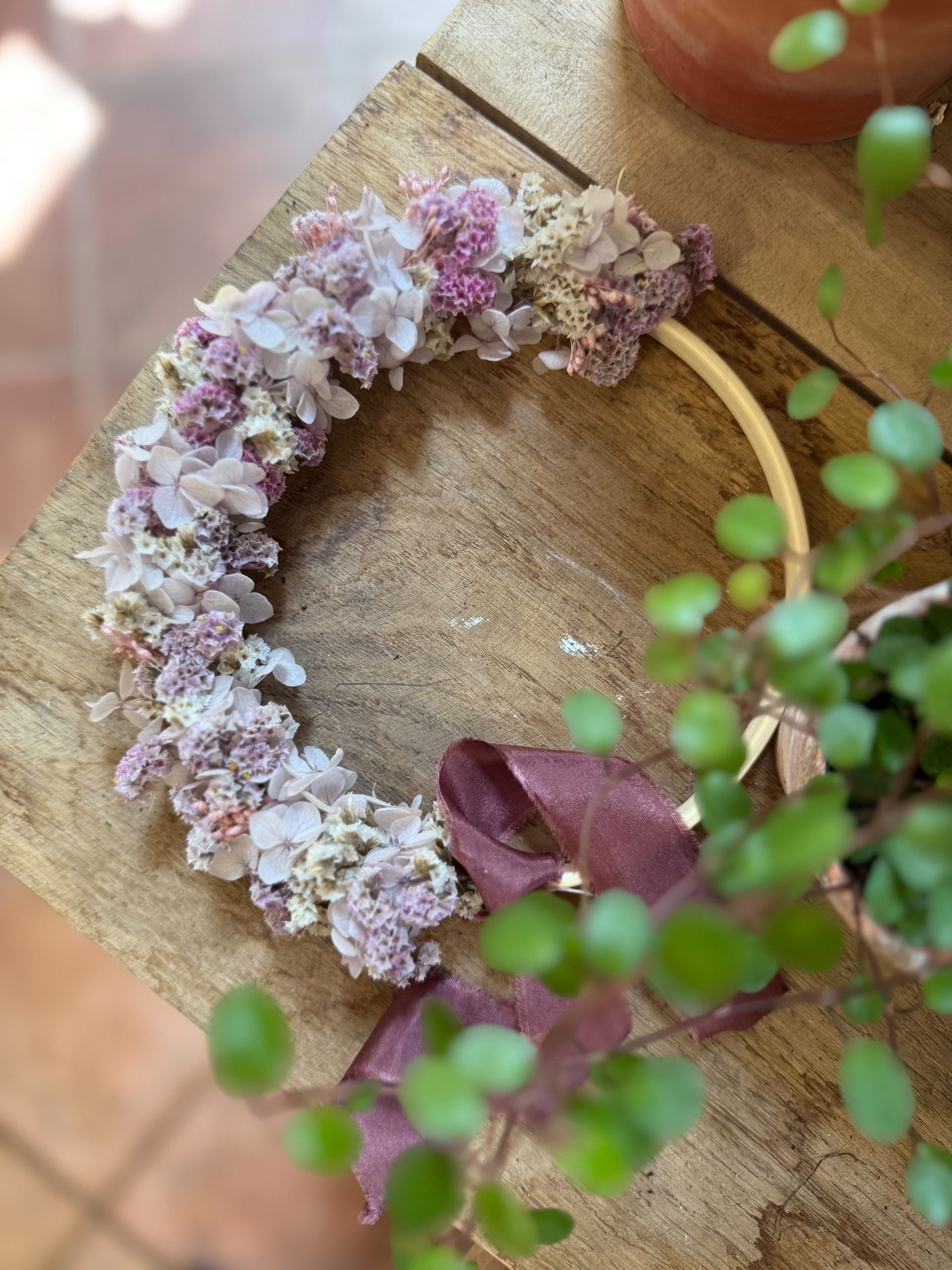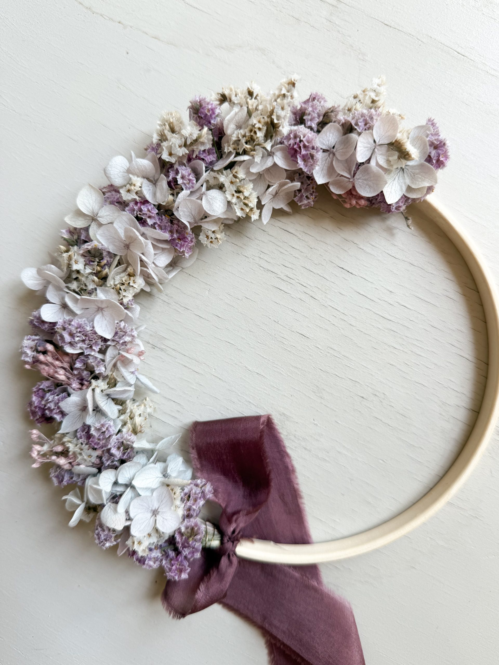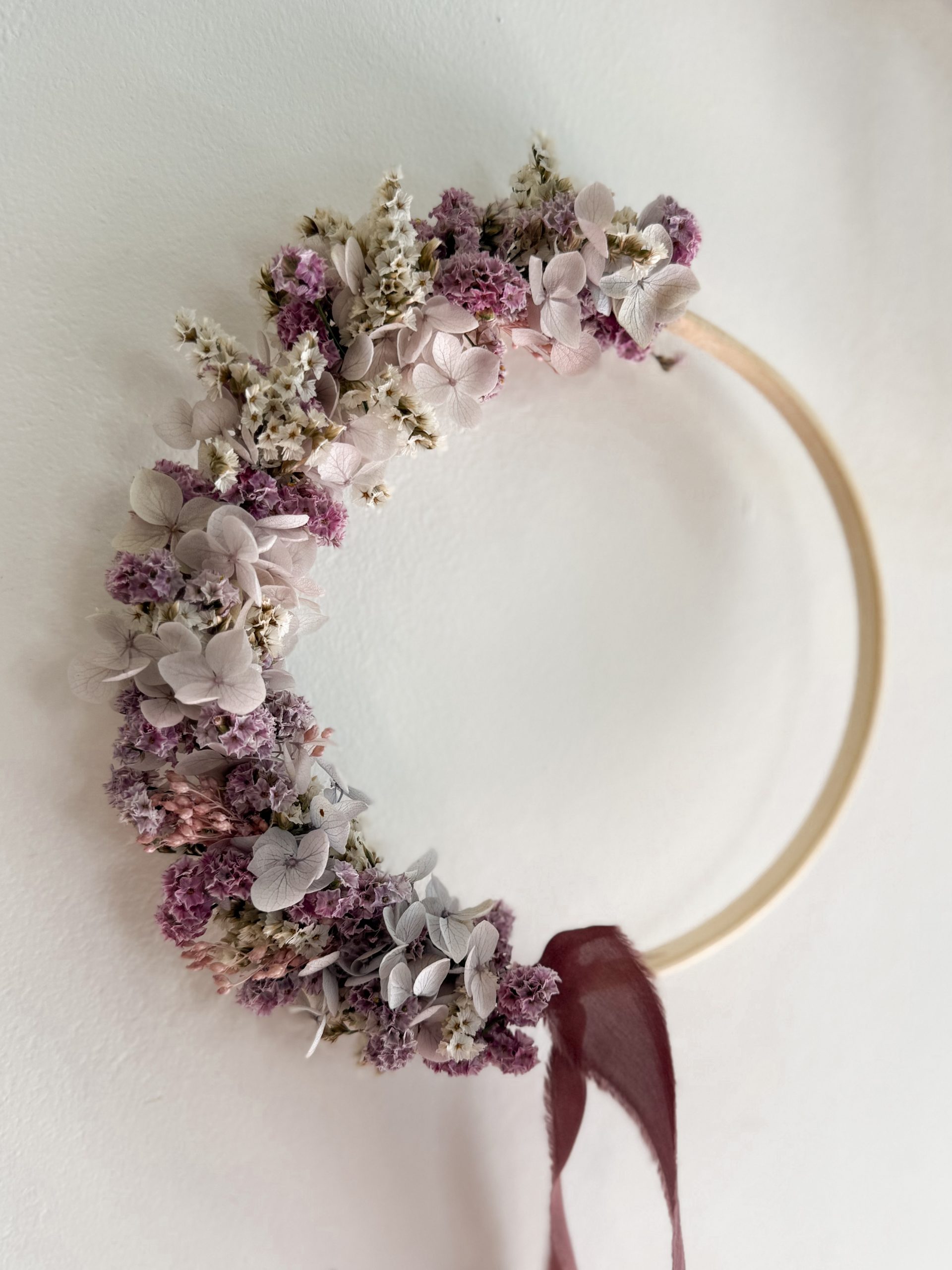 Une couronne pleine de tendresse, aux teintes délicates de mauve, lavande, blanc crème et rose poudré. Composée d’hortensias stabilisés, de statices et d’immortelles, elle est nouée d’un ruban en soie couleur lit de vin pour une touche originale.
