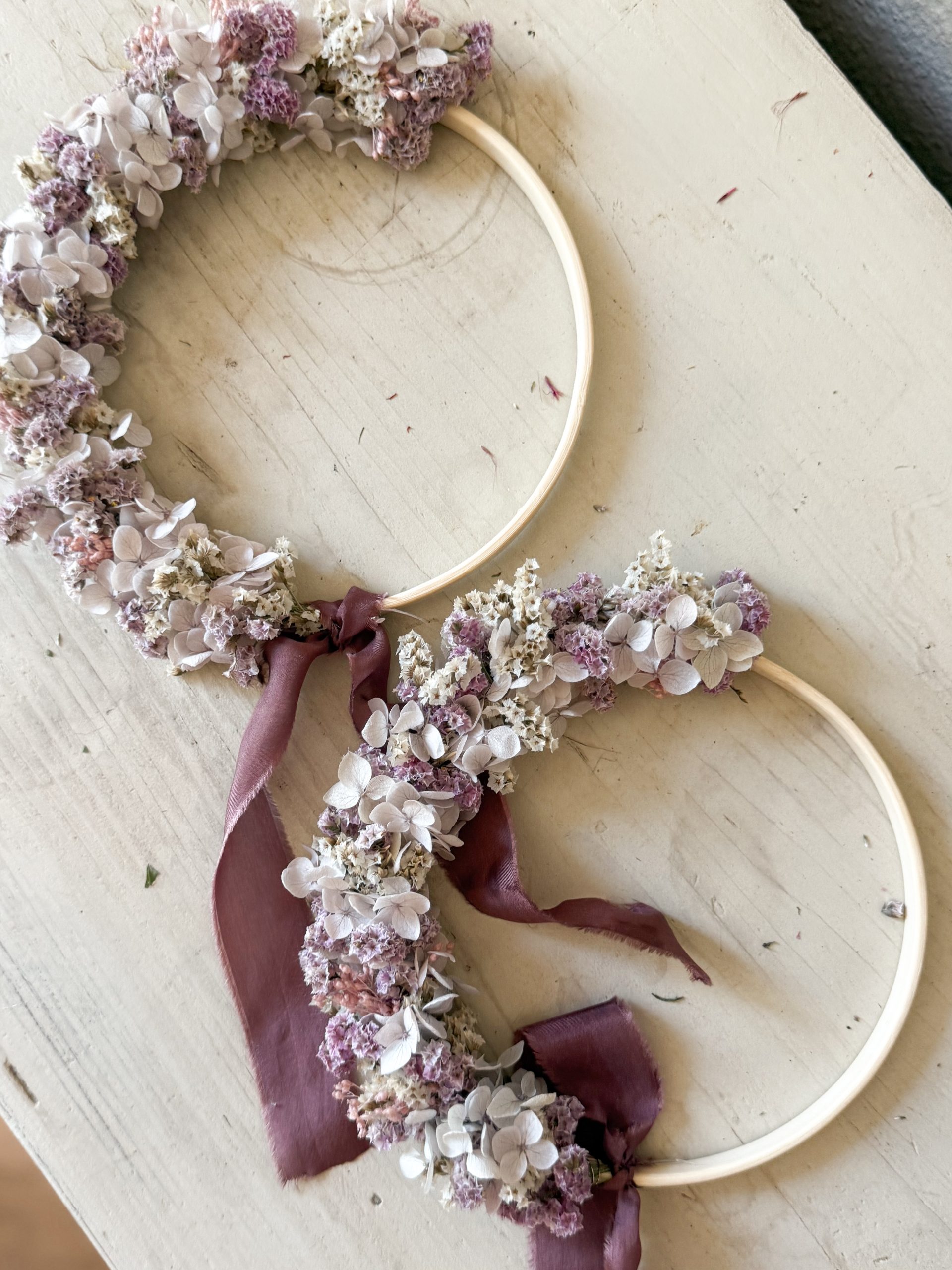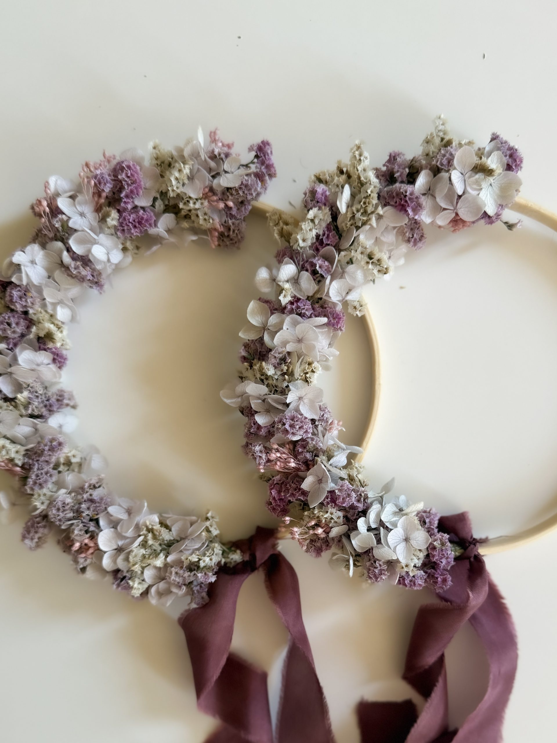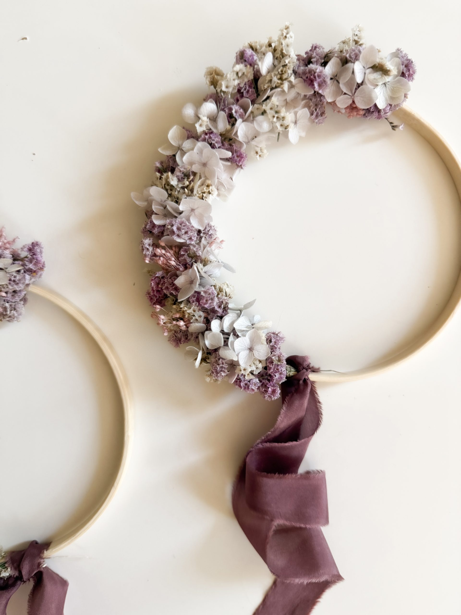 Une couronne pleine de tendresse, aux teintes délicates de mauve, lavande, blanc crème et rose poudré. Composée d’hortensias stabilisés, de statices et d’immortelles, elle est nouée d’un ruban en soie couleur lit de vin pour une touche originale.