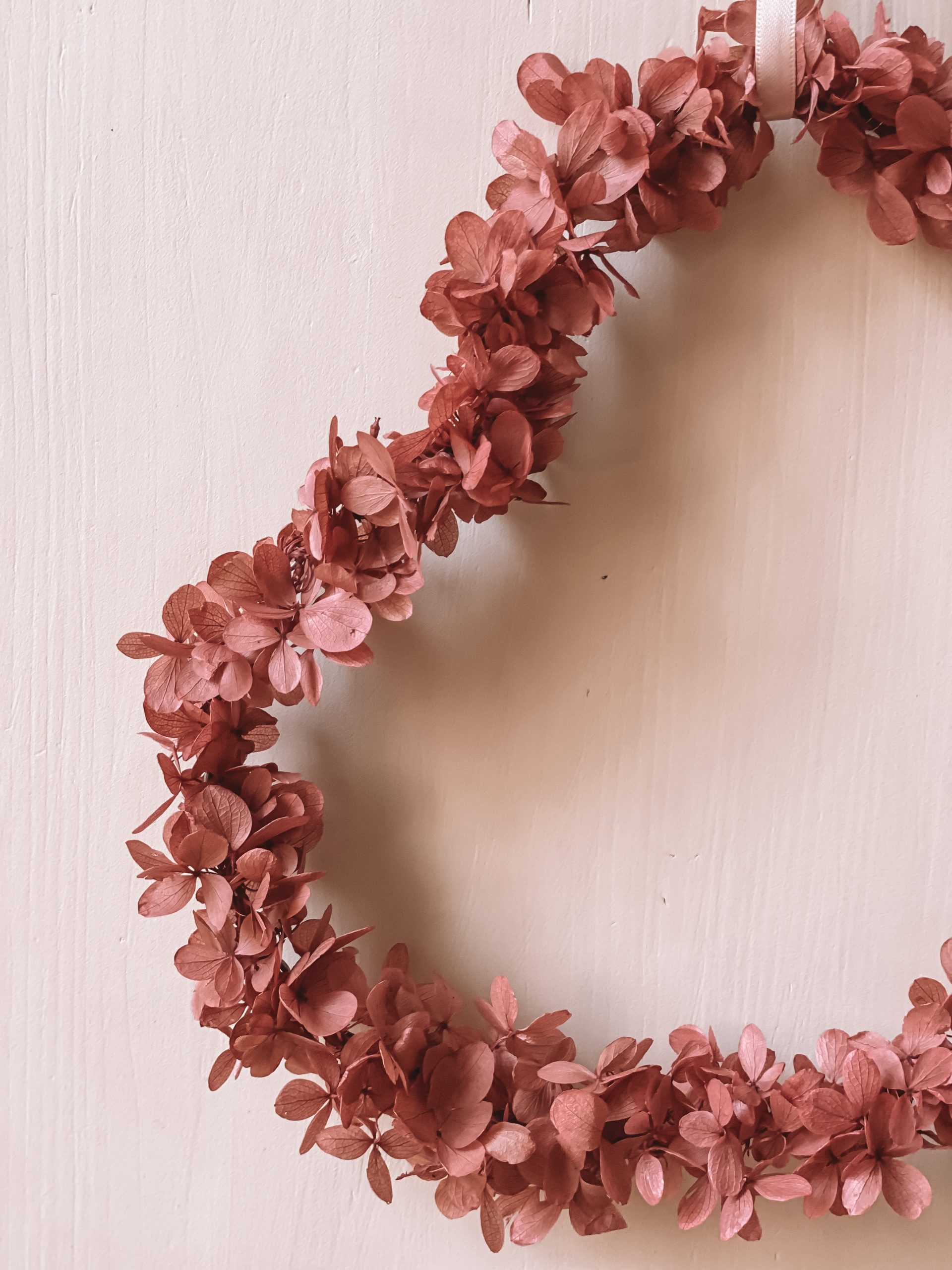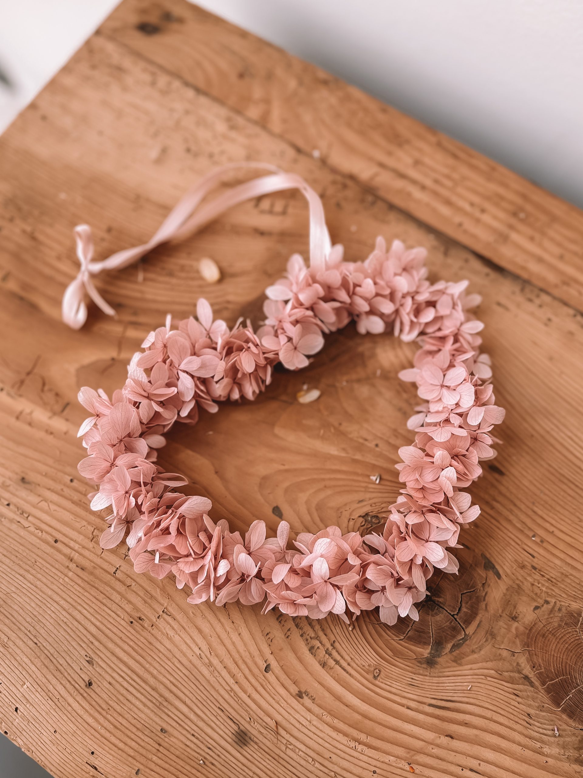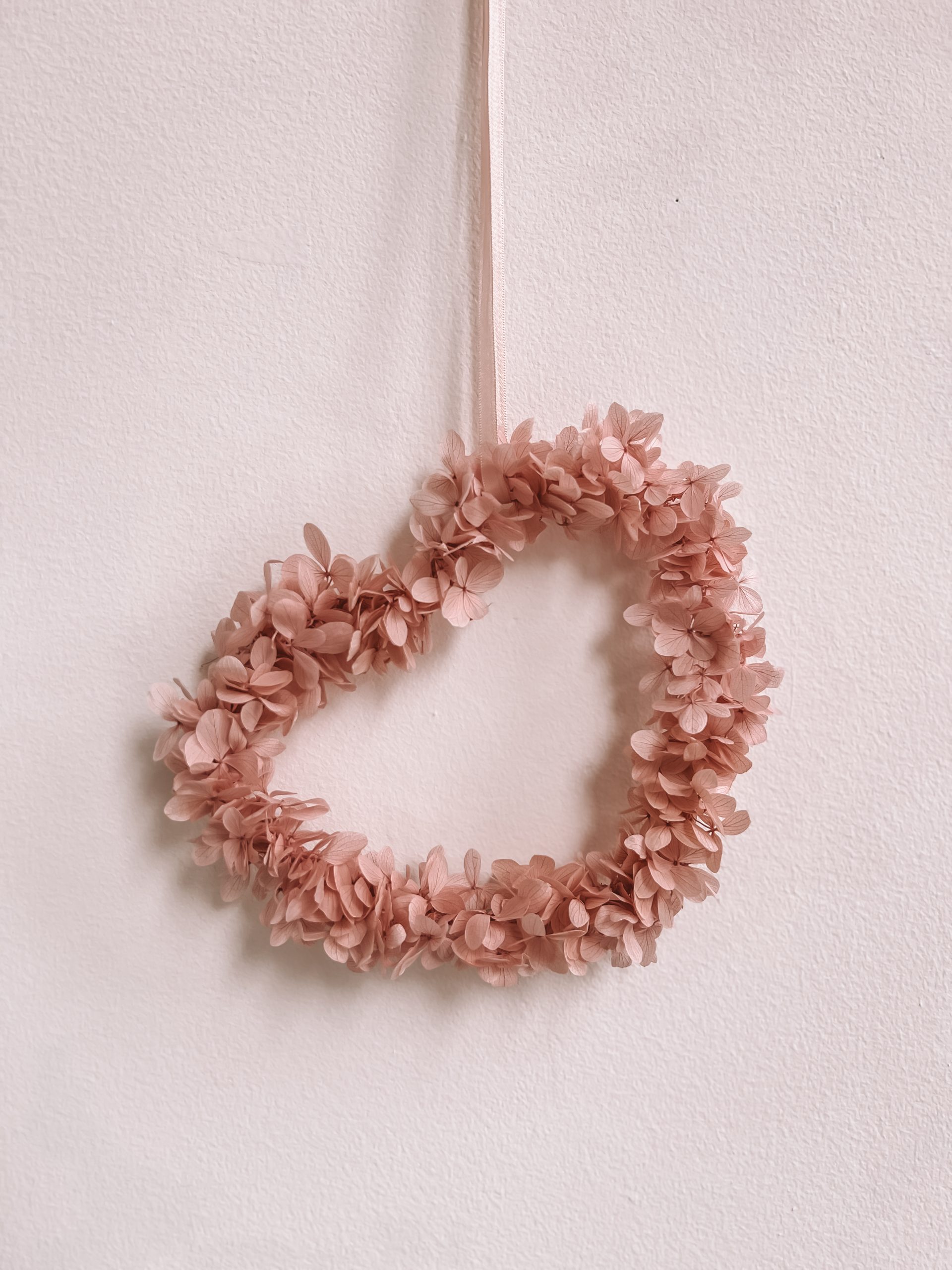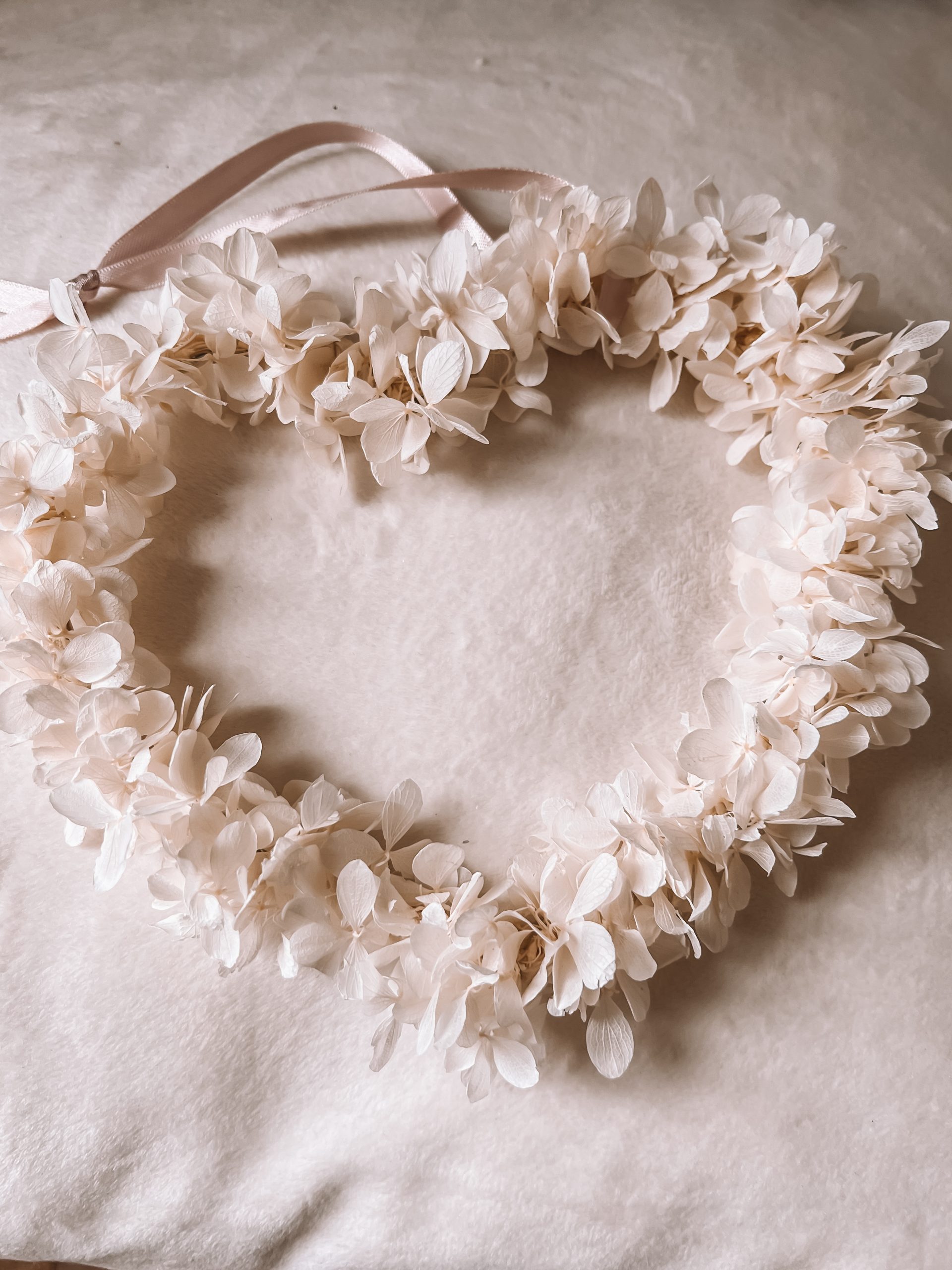 Offrez ou offrez-vous un tendre symbole d’amour et de délicatesse avec ce magnifique cœur composé de pétales d’hortensia stabilisés, disponibles en rose, blanc et bois de rose.